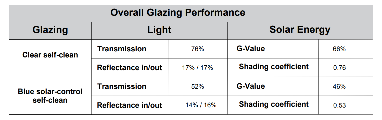 Available with clear self-clean or blue solar-control self-clean glass as standard. Other glazing options are available on request. If non-standard glass is used, glazing performance may differ from the table shown.