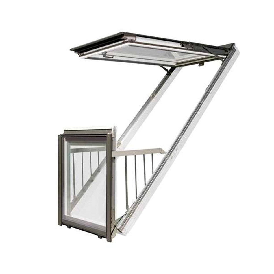 • Innovative, large roof window in which the open sashes create a balcony. The upper sash is opened upwards, the lower forward allowing easy access to the balcony bay.