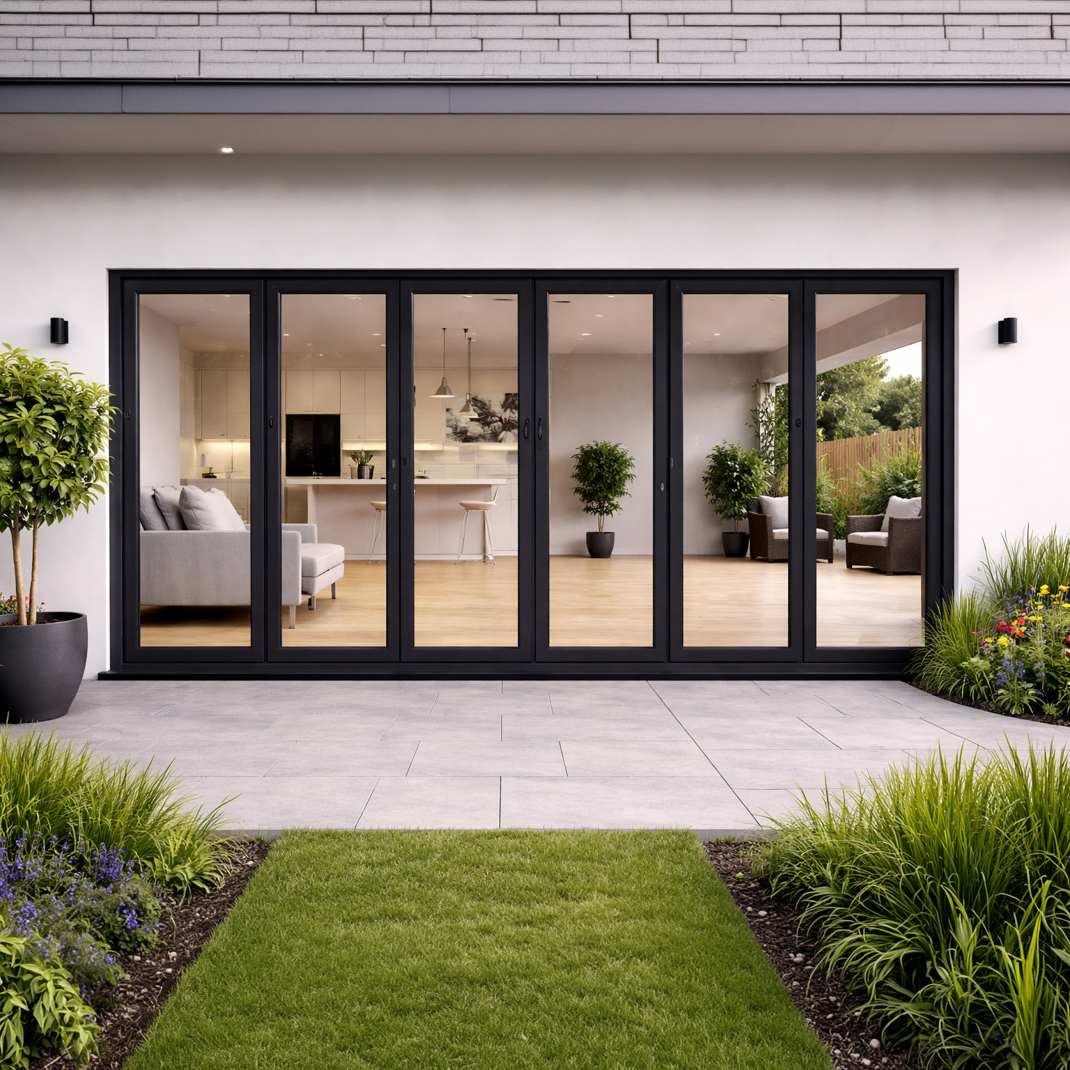Our sleek and modern 6 Pane Aluminium Bifold Doors from Alunet are handcrafted to our customer’s specifications using our class-leading Bifold Door System.