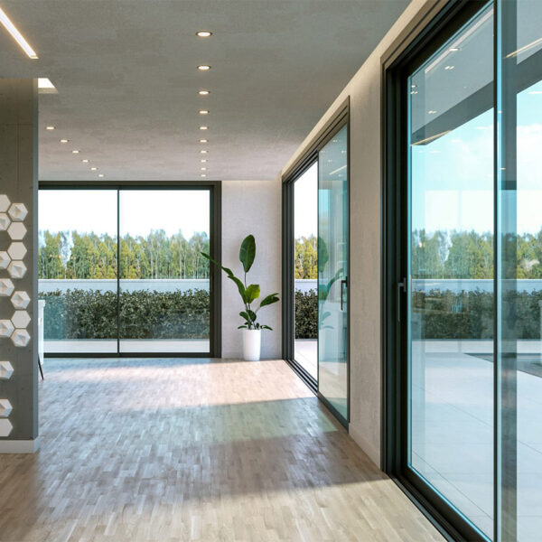 Alunet sliding doors help to frame the picturesque outdoors while providing your home with natural light. They form a transparent barrier, seamlessly integrating indoor and outdoor spaces.